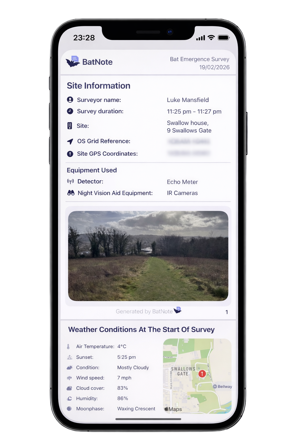 BatNote is a field-first iOS app for bat emergence surveys. Capture site details, weather and observations on-site, then generate a clean PDF report without rewriting everything later.